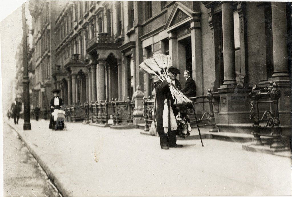 Favorite this☆ Broom peddler, New York Description: View of vendor carrying load of brooms and brushes on sidewalk in New York. Woman pushes baby carriage in background. Handwritten on back: "Streets--New York, 1908." Details Resource ID: na019179 Subject: Peddlers--New York (State)--New York Brooms and brushes--New York (State)--New York Photographic prints Date Issued: 1908 Format: 1 photographic print ; 4.5 x 6.75 in. Member of: National Automotive History Collection Lazarnick Collection Filing Location: Streets--New York #2 Rights: Physical rights are retained by DPL. Copyright is retained in accordance with U.S. copyright laws.