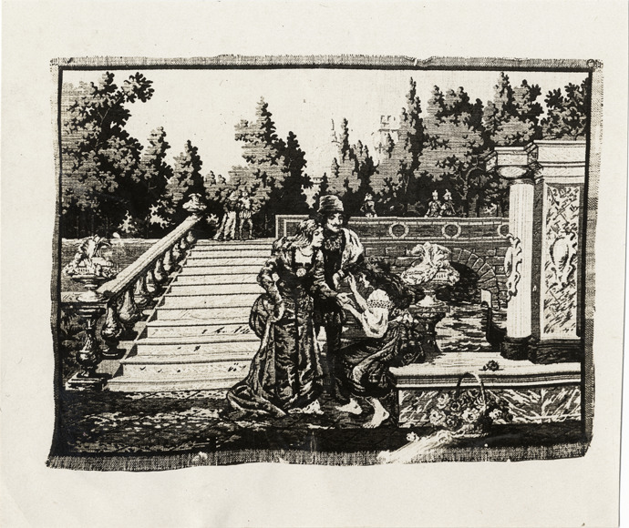 Favorite this☆ Tapestry depicting couple with palm reader Description: View of tapestry depicting man and woman with palm reader or fortune teller at foot of stairs in garden. Handwritten on back: "Tapestry, 1908." Details Resource ID: na019201 Subject: Tapestry Fortune-telling in art Couples in art Photographic prints Date Issued: 1908 Format: 1 photographic print ; 4 x 4.75 in. Member of: National Automotive History Collection Lazarnick Collection Filing Location: Tapestry Rights: Physical rights are retained by DPL. Copyright is retained in accordance with U.S. copyright laws.