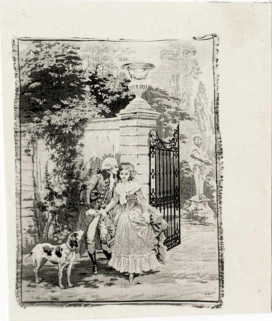 Favorite this☆ Tapestry depicting couple and dog in front of gate Description: View of tapestry depicting man and woman with dog in front of gate; statue in background. Handwritten on back: "Tapestry, 1908." Details Resource ID: na019202 Subject: Tapestry Dogs in art Couples in art Gates in art Photographic prints Date Issued: 1908 Format: 1 photographic print ; 4.25 x 3.75 in. Member of: National Automotive History Collection Lazarnick Collection Filing Location: Tapestry Rights: Physical rights are retained by DPL. Copyright is retained in accordance with U.S. copyright laws.