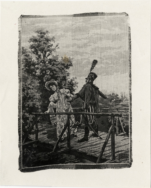 Favorite this☆ Tapestry depicting woman and soldier on bridge Description: View of tapestry depicting a woman standing with a uniformed soldier on wooden bridge. Handwritten on back: "Tapestry, 1908." Details Resource ID: na019203 Subject: Tapestry Soldiers in art Women in art Bridges in art Photographic prints Date Issued: 1908 Format: 1 photographic print ; 4.5 x 3.5 in. Member of: National Automotive History Collection Lazarnick Collection Filing Location: Tapestry Rights: Physical rights are retained by DPL. Copyright is retained in accordance with U.S. copyright laws.