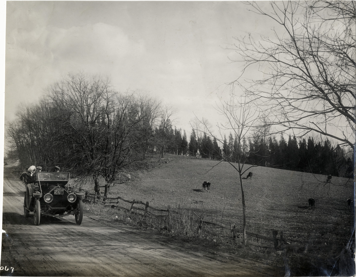 View of men and women in 1911 Thomas car, driving past cows in pasture. Stamped on back: "Spooner & Wells, Inc., photographers, telephones 3472-3473 Columbus, 1931 Broadway, New York." Handwritten on back: "Thomas, 1911."