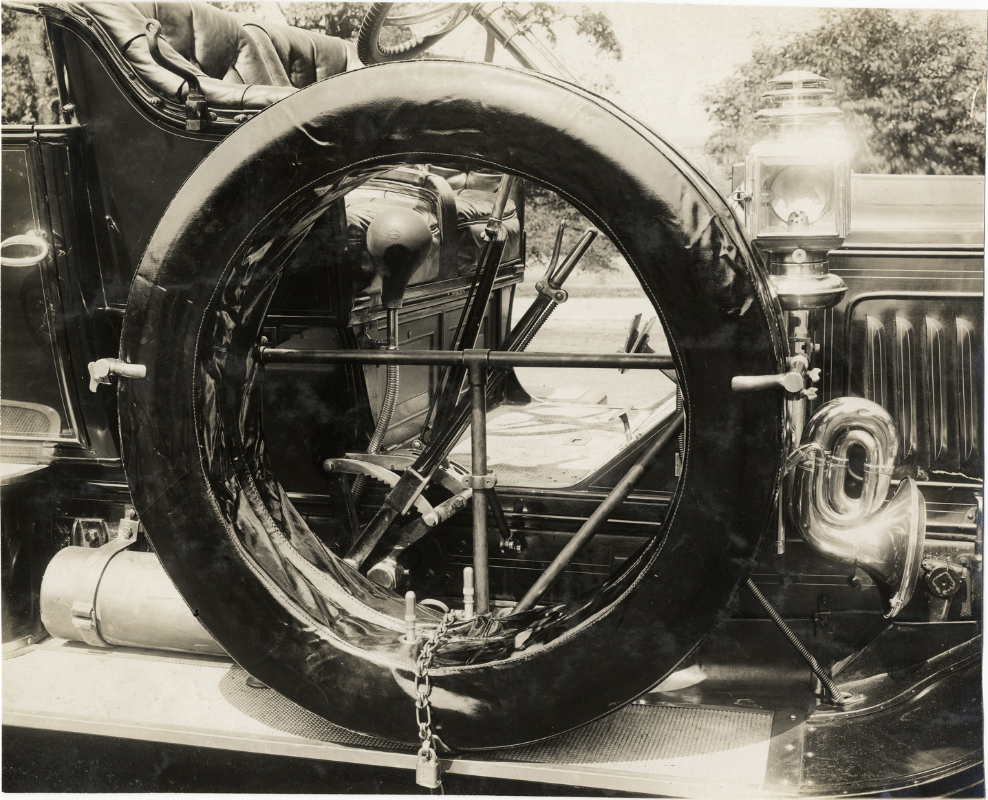 Favorite this☆ Tire cover Description: Close-up view of tire cover attached to car. Stamped on back: "Spooner & Wells, Inc., photographers, telephones 3472-3473 Columbus, 1931 Broadway, New York." Handwritten on back: "Tire trunks and covers, 1910." Details Resource ID: na019267 Creator: Spooner & Wells Subject: Automobiles--Tires--Equipment and supplies Photographers--New York (State)--New York Photographic prints Date Issued: 1910 Format: 1 photographic print ; 7.75 x 9.5 in. Member of: National Automotive History Collection Lazarnick Collection Filing Location: Tire trunks and covers Rights: Physical rights are retained by DPL. Copyright is retained in accordance with U.S. copyright laws.