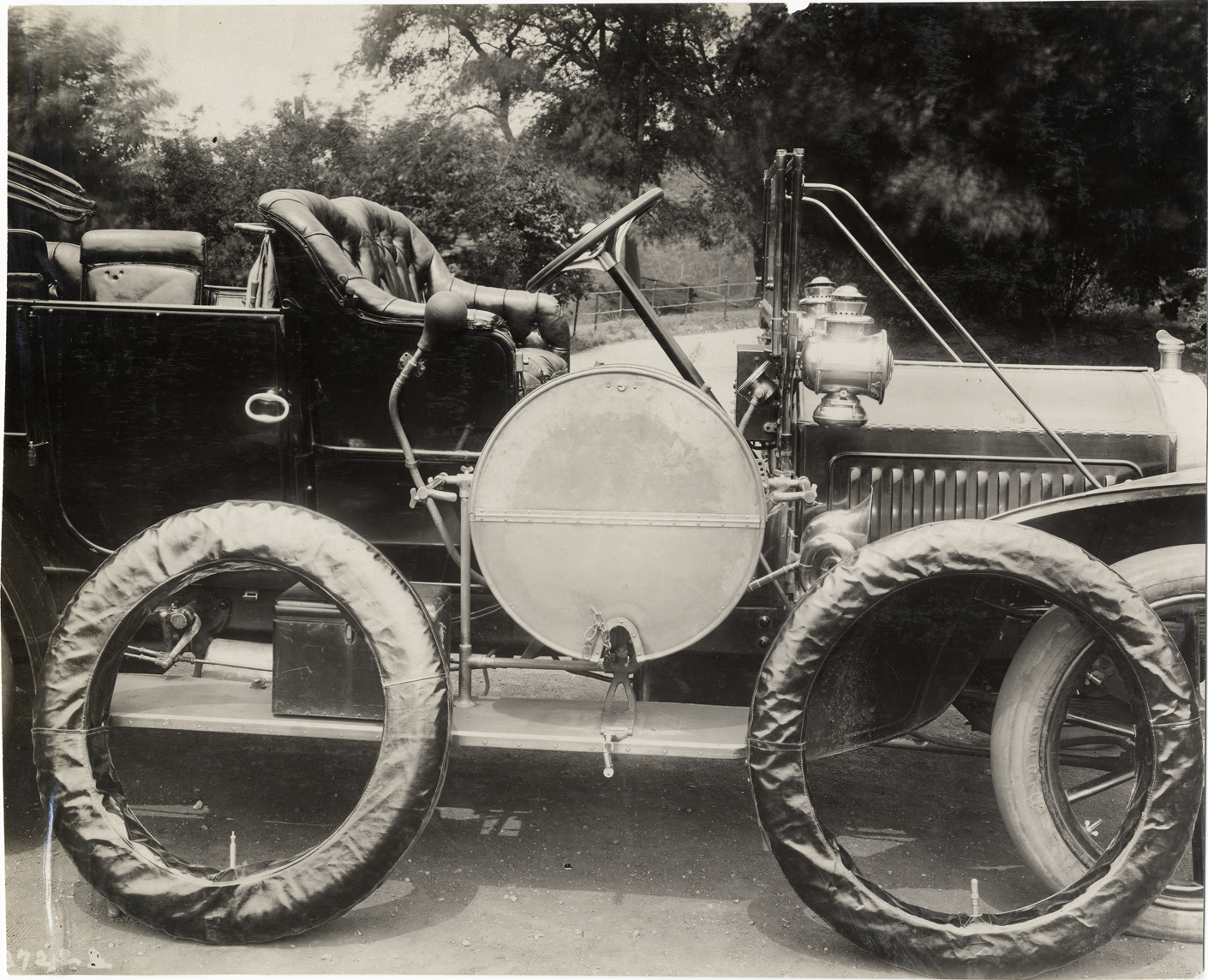 View of tire trunk and tire covers displayed next to car. Stamped on back: "Spooner & Wells, Inc., photographers, telephones 3472-3473 Columbus, 1931 Broadway, New York." Handwritten on back: "Tire trunks and covers, 1910."