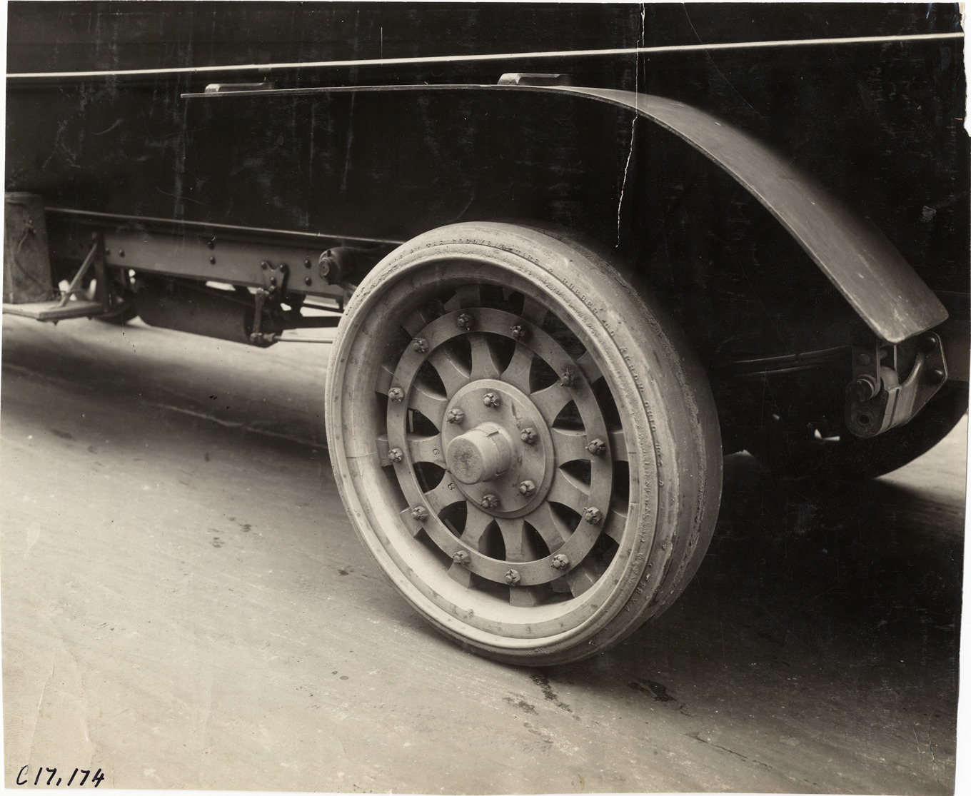 Close-up view of Goodyear tire on truck. Stamped on back: "Spooner & Wells, Inc., photographers, telephones 3472-3473 Columbus, 1931 Broadway, New York." Handwritten on back: "Tires--Goodyear, 1908."