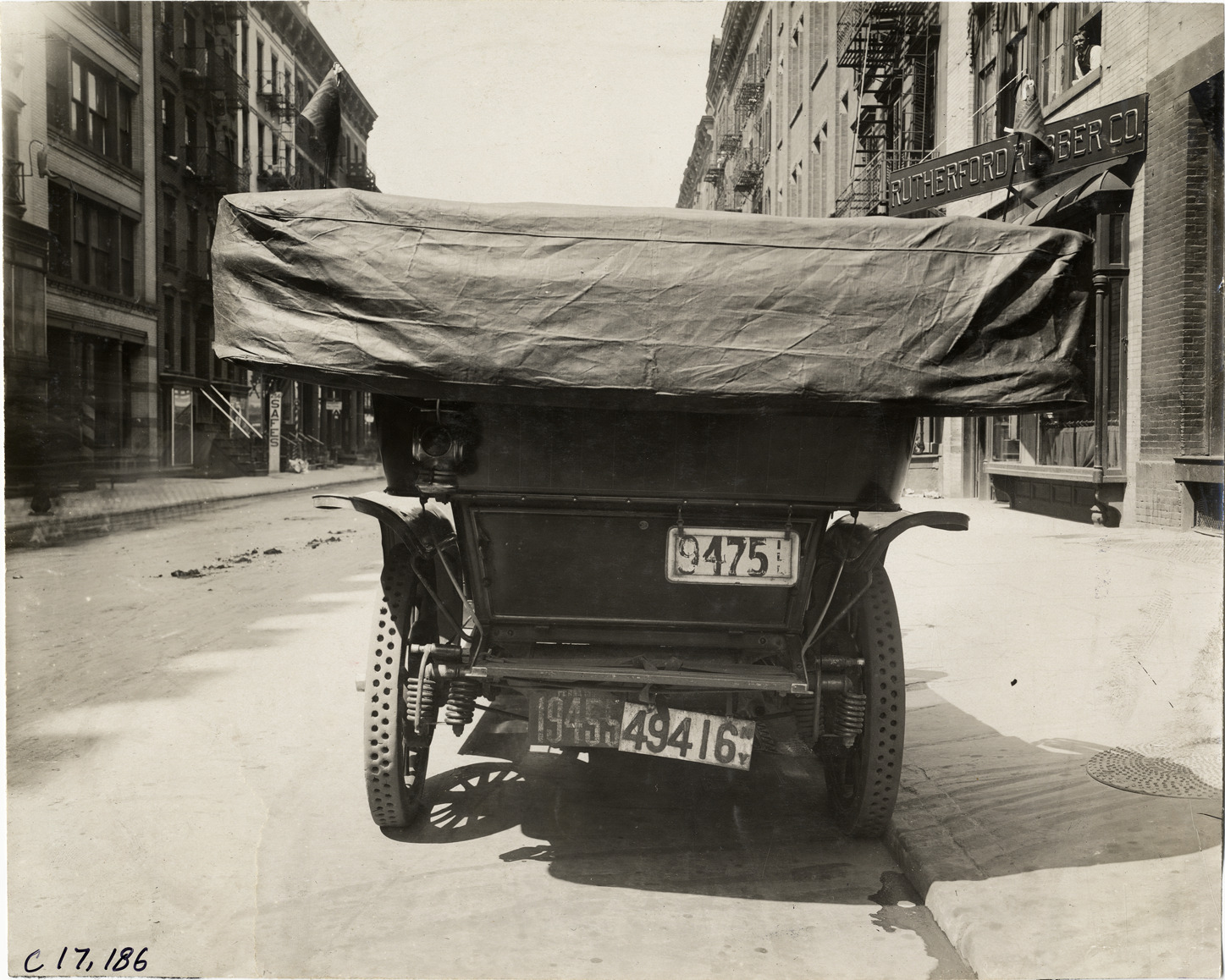 Rear view of car with Rhinehart tires, parked in front of the Rutherford Rubber Company. Handwritten on back: "Tires--Rhinehart tires, 1908."