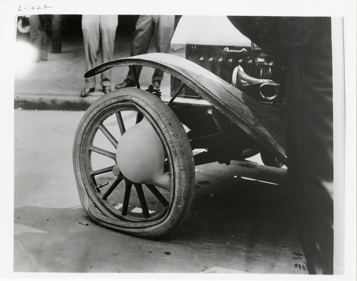 Favorite this☆ Flat G & J tire on automobile Description: Close-up view of flat G & J tire on car. Handwritten on back: "Tires, taken in 1910." Details Resource ID: na019303 Subject: Automobiles--Tires Photographic prints Date Issued: 1910 Format: 1 photographic print ; 8 x 10 in. Member of: National Automotive History Collection Lazarnick Collection Filing Location: Tires #1 Rights: Physical rights are retained by DPL. Copyright is retained in accordance with U.S. copyright laws.
