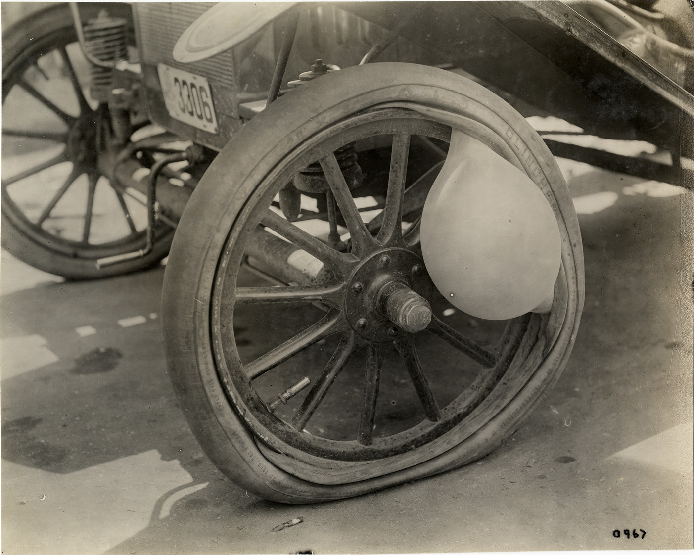 View of flat G & J tire on car, showing inner tube. Stamped on back: "Spooner & Wells, Inc., photographers, telephone North 1745. 1231 Woodward Ave., Detroit, Mich. Detroit, 1231 Woodward, New York, 1931 Broadway." Handwritten on back: "Tires, 1910."