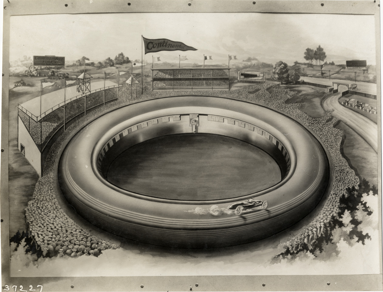Artist's depiction of a Continental tire as a racetrack. Car races around track; "Continental" flag is displayed over crowd in grandstand. Stamped on back: "Spooner & Wells, Inc., photographers, telephones 3472-3473 Columbus, 1931 Broadway, New York." Handwritten on back: "Tires--Continental, 1910."
