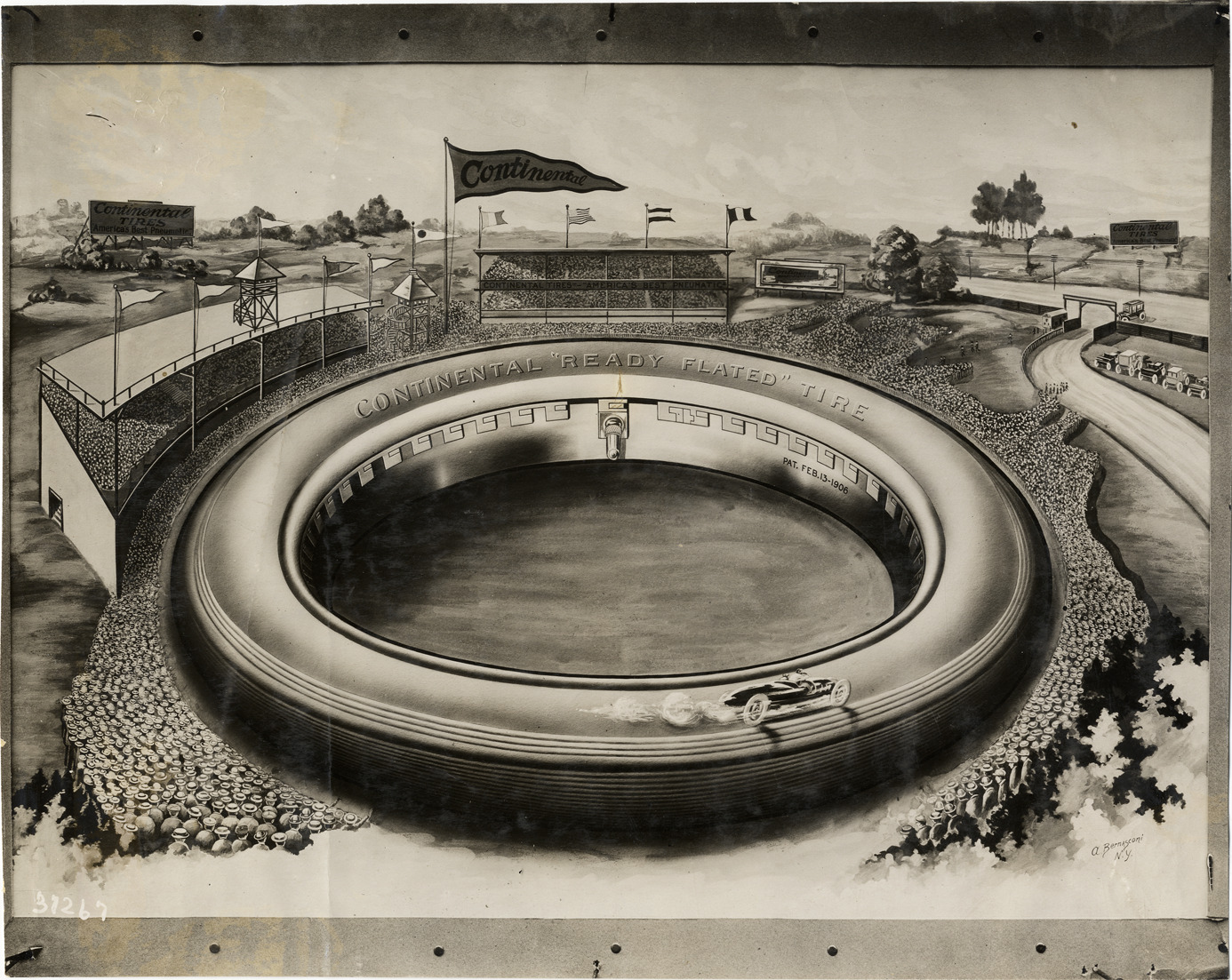 Artist's depiction of a Continental tire as a racetrack. Car races around track; "Continental" flag is displayed over crowd in grandstand. Signed on front: "A. Bernasconi, N.Y." Stamped on back: "Spooner & Wells, Inc., photographers, telephones 3472-3473 Columbus, 1931 Broadway, New York." Handwritten on back: "Tires--Continental, 1910."