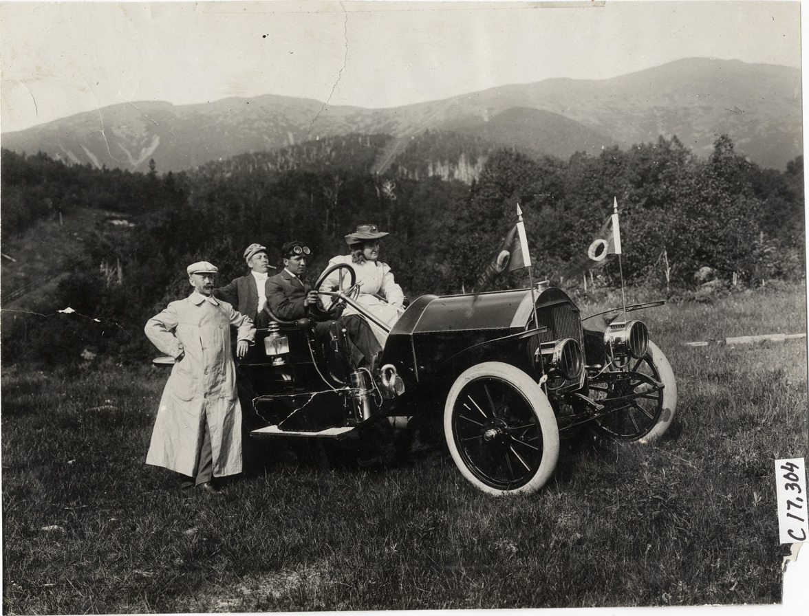 Motorists posing with automobile in mountainous area, 1908 Automobile Club of America Ideal Tour