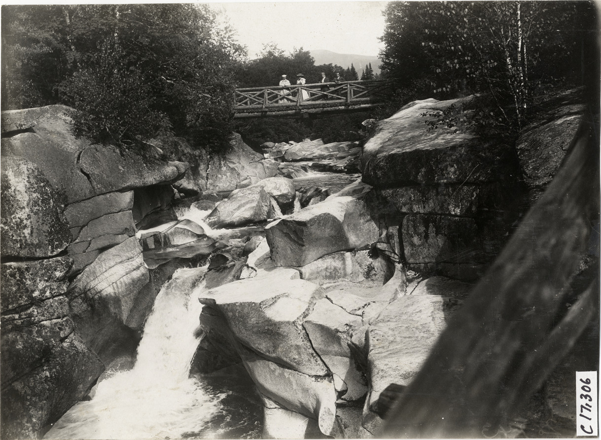 Men and woman on wooden bridge over mountain stream, 1908 Automobile Club of America Ideal Tour