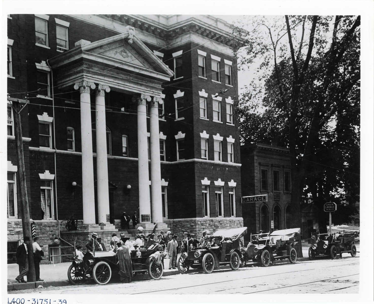 View of cars parked in front of brick Neoclassical style Hotel Green in Danbury, Connecticut during the 1908 Automobile Club of America Ideal Tour from New York to Portland, Maine. Building has pediment supported by columns; men and women stand on sidewalk. Green Garage is adjacent to the hotel. Handwritten on back: "Tours--Automobile Club of America Ideal Tour, 1908. New York to Portland, Maine."