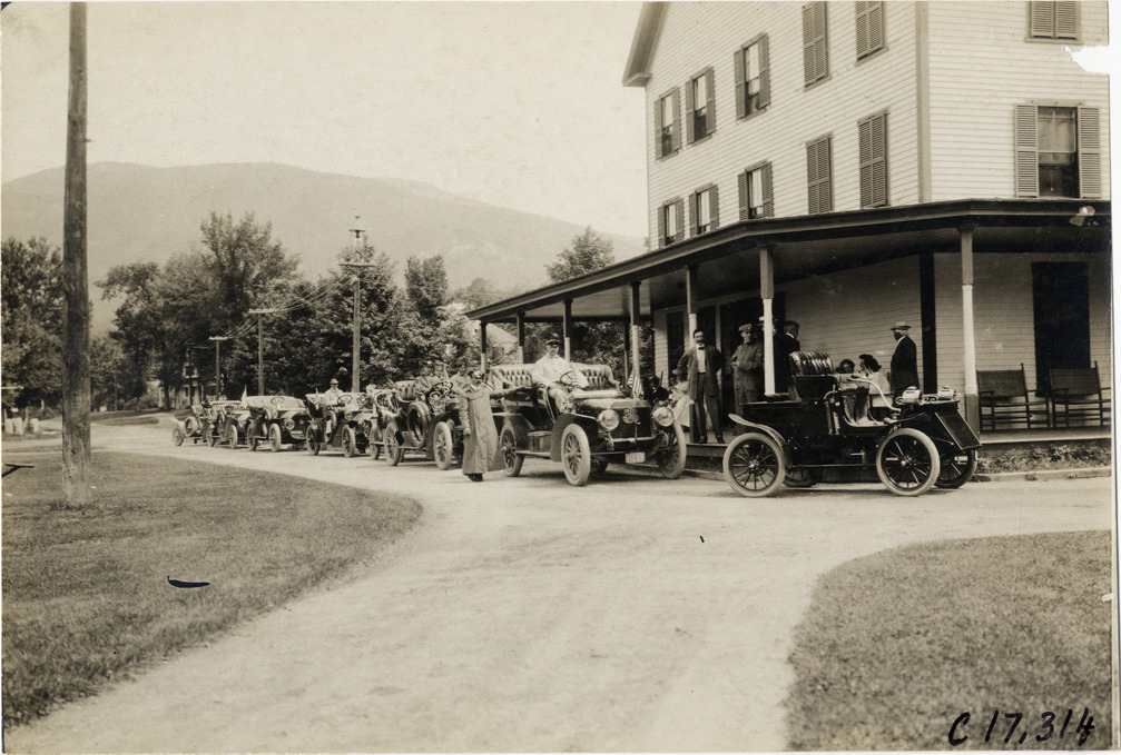 View of row of cars parked in front of wooden-frame hotel during the 1906 Boston to Bretton Woods Tour. Stamped on back: "Photo by N. Lazarnick, 29 West 42nd Street, New York." Handwritten on back: "Tours--Boston to Bretton Woods Tour, 1906."