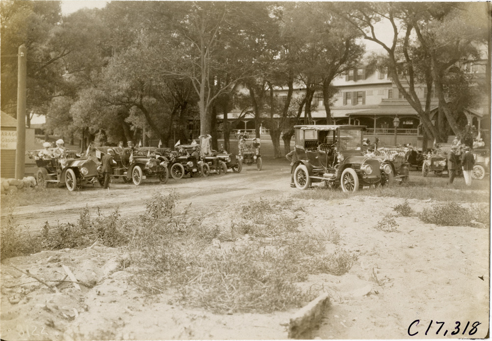 Favorite this☆ Automobiles parked in front of hotel, 1906 Boston to Bretton Woods Tour Description: View of cars parked in front of wooden-frame hotel during the 1906 Boston to Bretton Woods Tour. Handwritten on back: "Tours--Boston to Bretton Woods Tour, 1906." Details Resource ID: na019384 Subject: Automobiles--New England Hotels--New England Automobile travel--New England Photographic prints Date Issued: 1906 Format: 1 photographic print ; 4.75 x 6.75 in. Member of: National Automotive History Collection Lazarnick Collection Filing Location: Tours--Boston to Bretton Woods Tour, 1906 #1 Negative Number: Negative #C17,318 Rights: Physical rights are retained by DPL. Copyright is retained in accordance with U.S. copyright laws.