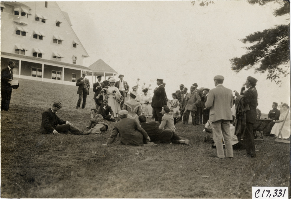 Men, women and children on lawn in front of Bay of Naples Inn, 1906 Boston to Bretton Woods Tour