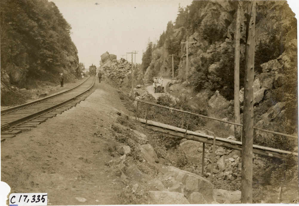 View of train approaching on railroad tracks during the 1906 Boston to Bretton Woods Tour. Car on mountain road on right; rustic wooden bridge in foreground. Two men stand next to tracks. Handwritten on back: "Tours--Boston to Bretton Woods Tour, 1906."