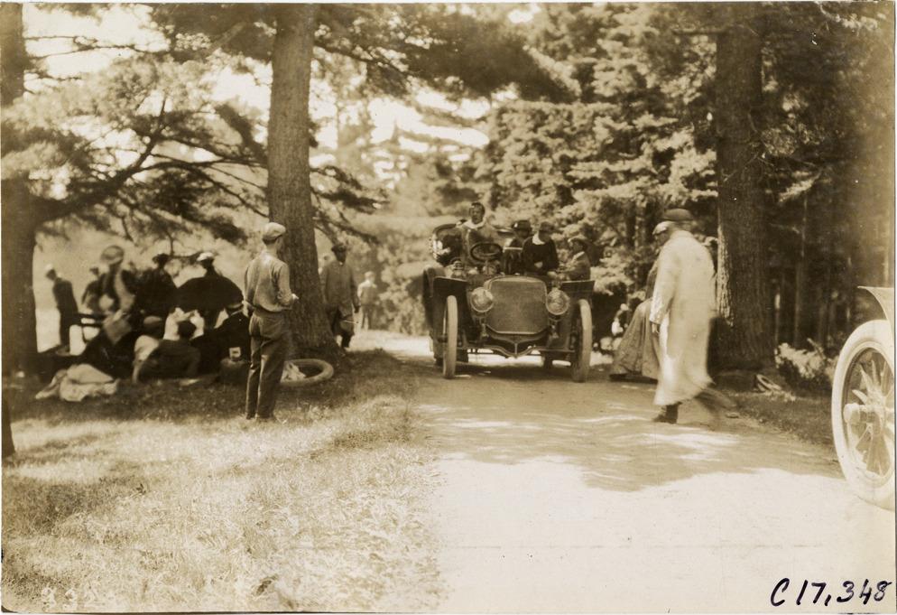 Motorists with automobile in road, 1906 Boston to Bretton Woods Tour