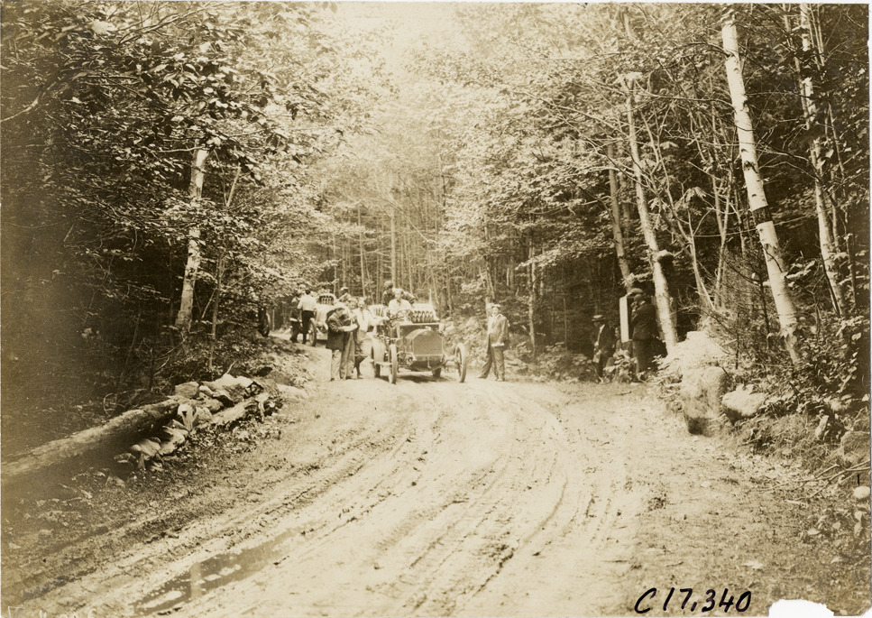 Motorists with automobile in road, 1906 Boston to Bretton Woods Tour