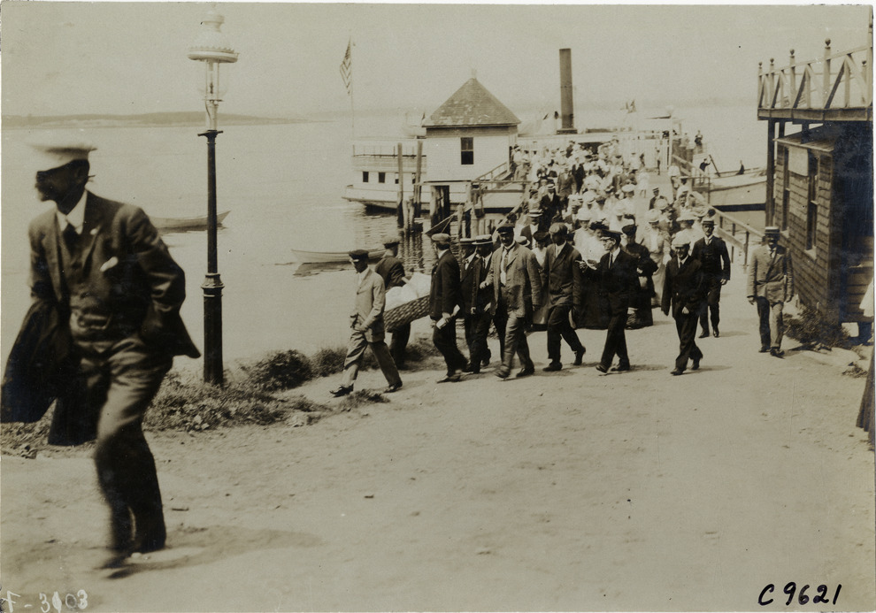 Tour participants leaving ferry, 1906 Boston to Bretton Woods Tour