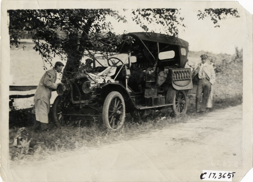 Motorists with automobile on roadside, 1910 Brooklyn Dealers Reliability Run