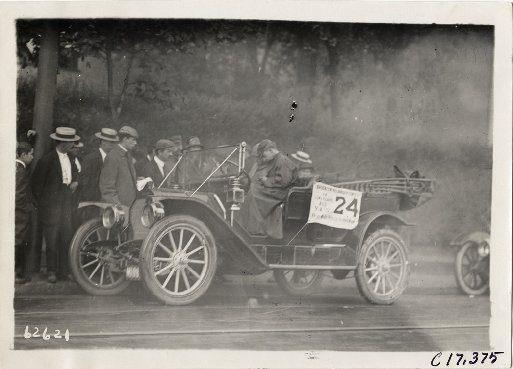 View of driver and passenger in car no. 24 during the 1910 Brooklyn Dealers Reliability Run on Long Island, New York. Onlookers stand on sidewalk. Stamped on back: "Spooner & Wells, Inc., photographers, telephones 3472-3473 Columbus, 1931 Broadway, New York." Handwritten on back: "Tours--Brooklyn Dealers Reliability Run, 1910."