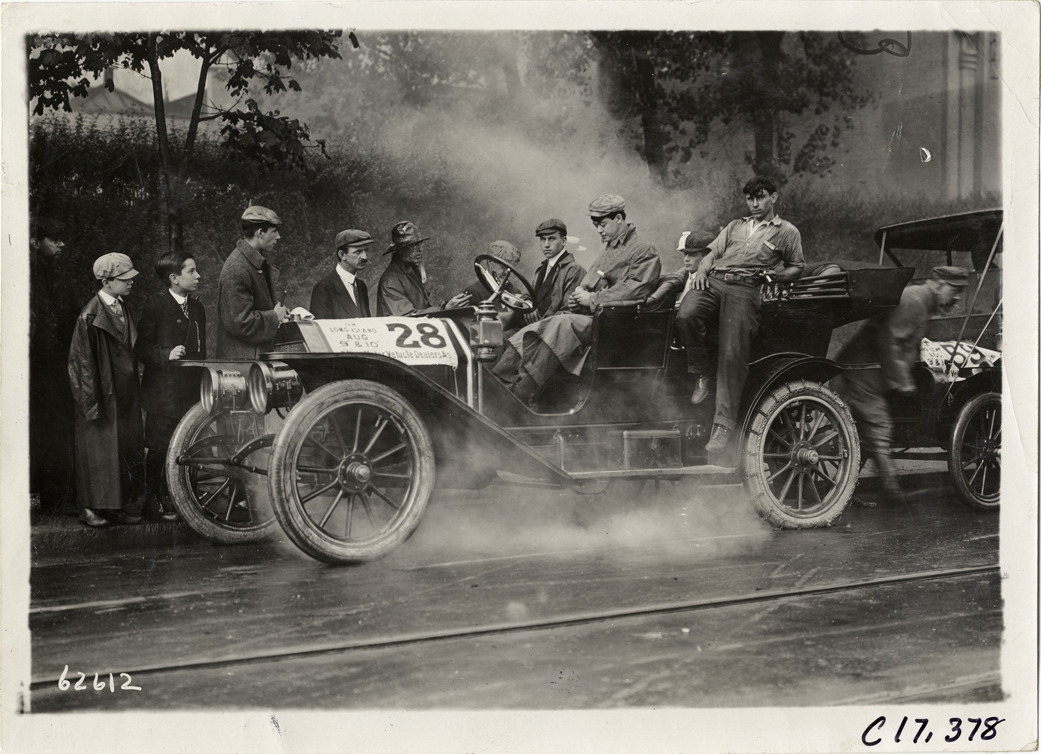 View of driver and passengers in car no. 28 during the 1910 Brooklyn Dealers Reliability Run on Long Island, New York. Onlookers stand on sidewalk. Stamped on back: "Spooner & Wells, Inc., photographers, telephones 3472-3473 Columbus, 1931 Broadway, New York." Handwritten on back: "Tours--Brooklyn Dealers Reliability Run, 1910."