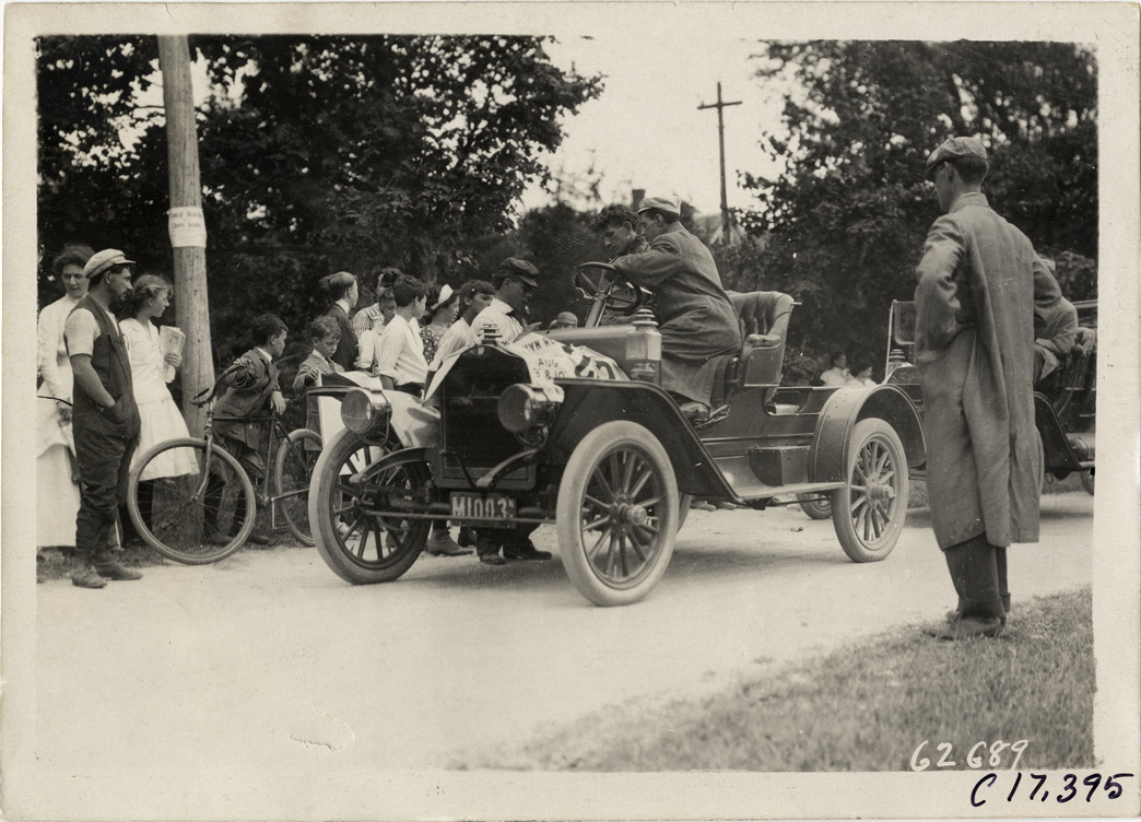 View of driver and passenger in car no. 25 during the 1910 Brooklyn Dealers Reliability Run on Long Island, New York. Onlookers, including boy with bicycle, stand on roadside. Stamped on back: "Spooner & Wells, Inc., photographers, telephones 3472-3473 Columbus, 1931 Broadway, New York." Handwritten on back: "Tours--Brooklyn Dealers Reliability Run, 1910."