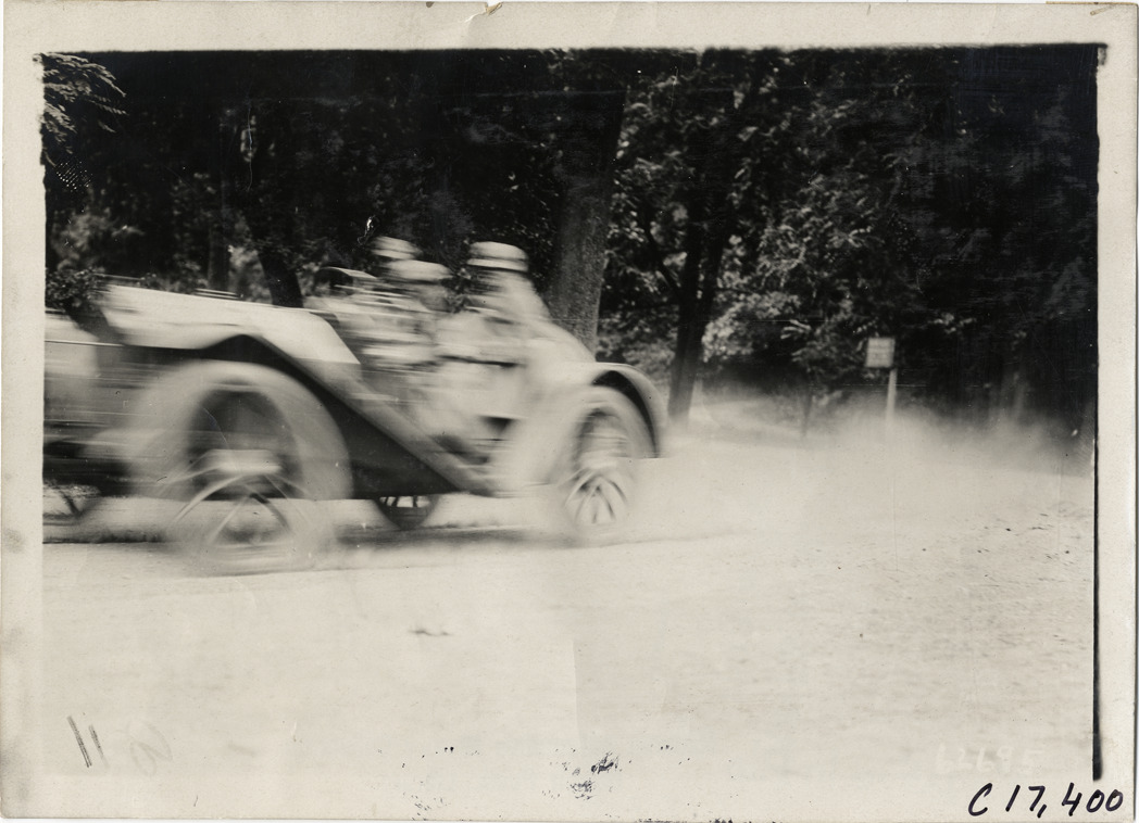 Blurred view of driver and passengers in car on rural road during the 1910 Brooklyn Dealers Reliability Run on Long Island, New York. Stamped on back: "Spooner & Wells, Inc., photographers, telephones 3472-3473 Columbus, 1931 Broadway, New York." Handwritten on back: "Tours--Brooklyn Dealers Reliability Run, 1910."