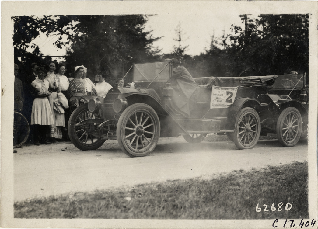View of driver and passenger in car no. 2 during the 1910 Brooklyn Dealers Reliability Run on Long Island, New York. Onlookers stand on roadside. Sign displayed on car reads: "Brooklyn Reliability Contest on Long Island, Aug. 9th & 10th, Bklyn Motor Vehicle Dealers Assn., 2." Stamped on back: "Spooner & Wells, Inc., photographers, telephones 3472-3473 Columbus, 1931 Broadway, New York." Handwritten on back: "Tours--Brooklyn Dealers Reliability Run, 1910."
