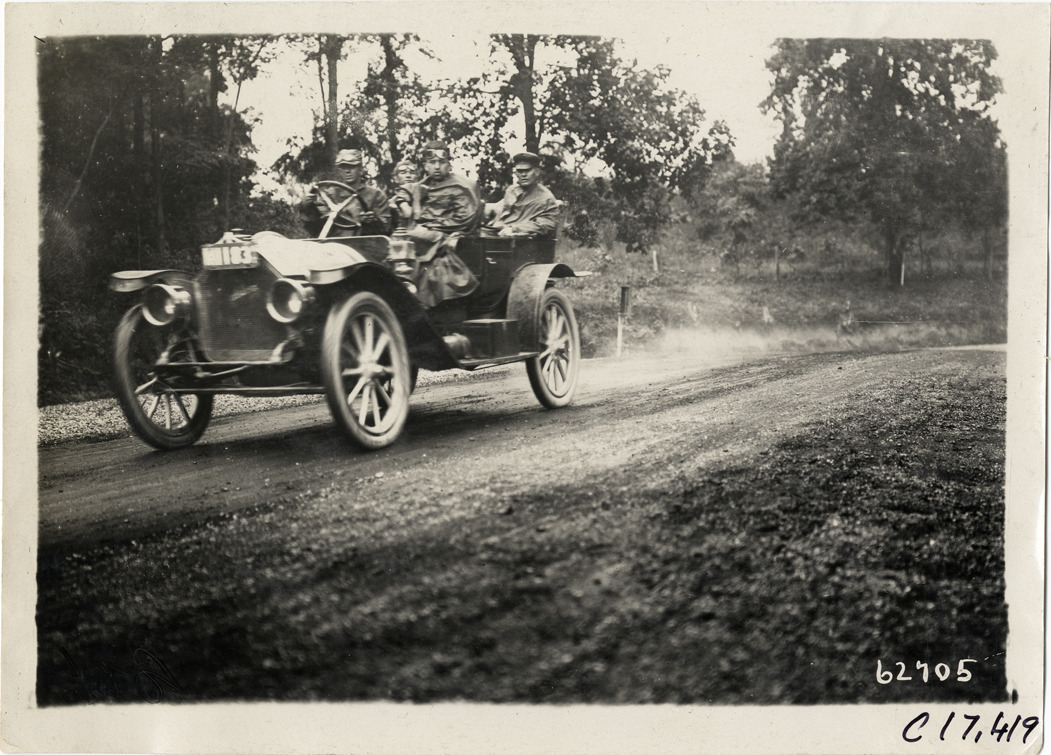 View of driver and passengers in car on rural road during the 1910 Brooklyn Dealers Reliability Run on Long Island, New York. Stamped on back: "Spooner & Wells, Inc., photographers, telephones 3472-3473 Columbus, 1931 Broadway, New York." Handwritten on back: "Tours--Brooklyn Dealers Reliability Run, 1910."