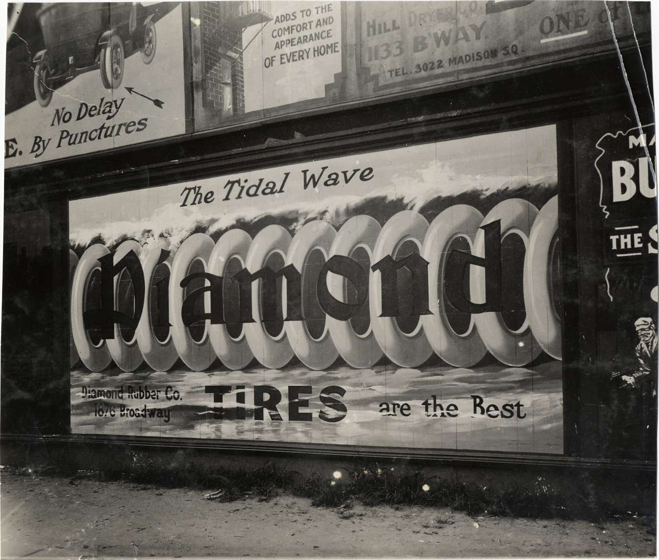 Favorite this☆ Billboard advertising Diamond tires Description: View of billboard advertising Diamond tires. Billboard reads: "The tidal wave, Diamond tires are the best, Diamond Rubber Co., 1876 Broadway." Handwritten on back: "Tires--Diamond, 1908." Details Resource ID: na019519 Subject: Automobiles--Tires Billboards Advertising--Tires Photographic prints Date Issued: 1908 Format: 1 photographic print ; 7.75 x 9 in. Member of: National Automotive History Collection Lazarnick Collection Filing Location: Tires--Diamond Rights: Physical rights are retained by DPL. Copyright is retained in accordance with U.S. copyright laws.