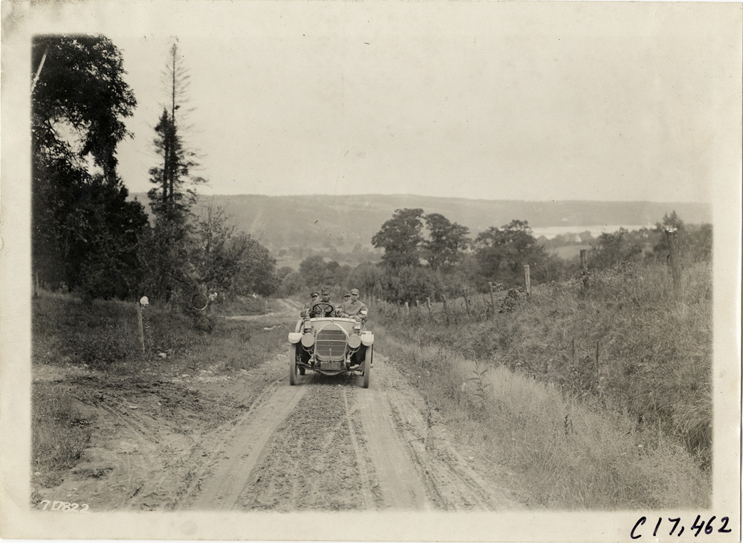 Front view of driver and passengers in car on rural road during the 1911 Buffalo Reliability Run in New York State. Stamped on back: "Spooner & Wells, Inc., photographers, telephones 3472-3473 Columbus, 1931 Broadway, New York." Handwritten on back: "Tours--Buffalo Reliability Run, 1911."