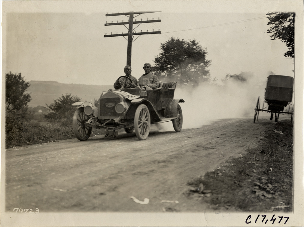 View of driver and passenger in Flanders car on rural road during the 1911 Buffalo Reliability Run in New York State. Horse-drawn carriage travels in opposite direction in background. Stamped on back: "Spooner & Wells, Inc., photographers, telephones 3472-3473 Columbus, 1931 Broadway, New York." Handwritten on back: "Tours--Buffalo Reliability Run, 1911."