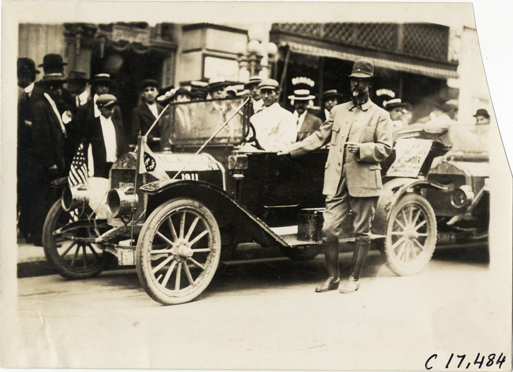 View of officials posing with Flanders "20" pathfinder car parked in front of building during the 1911 Buffalo Reliability Run in New York State. Onlookers stand on sidewalk in background. Stamped on back: "Spooner & Wells, Inc., photographers, telephones 3472-3473 Columbus, 1931 Broadway, New York." Handwritten on back: "Tours--Buffalo Reliability Run, 1911."