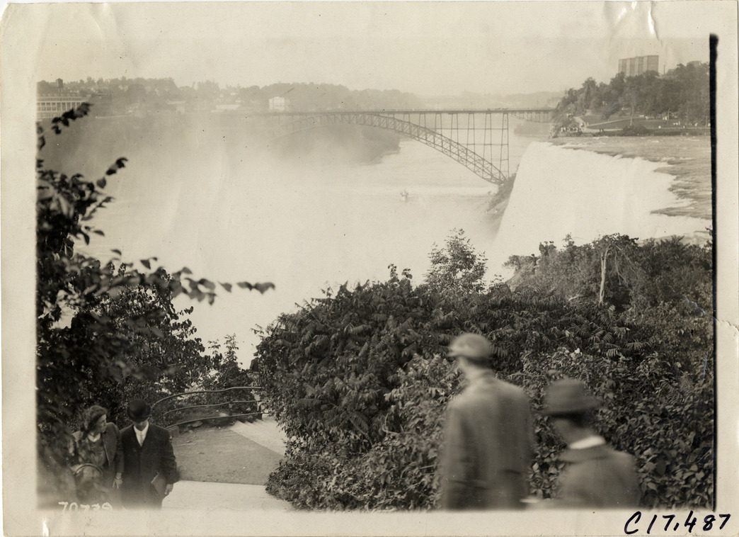 View of Upper Arch Bridge at Niagara Falls during the 1911 Buffalo Reliability Run in New York State. Pedestrians walk on path in foreground. Stamped on back: "Spooner & Wells, Inc., photographers, telephones 3472-3473 Columbus, 1931 Broadway, New York." Handwritten on back: "Tours--Buffalo Reliability Run, 1911."