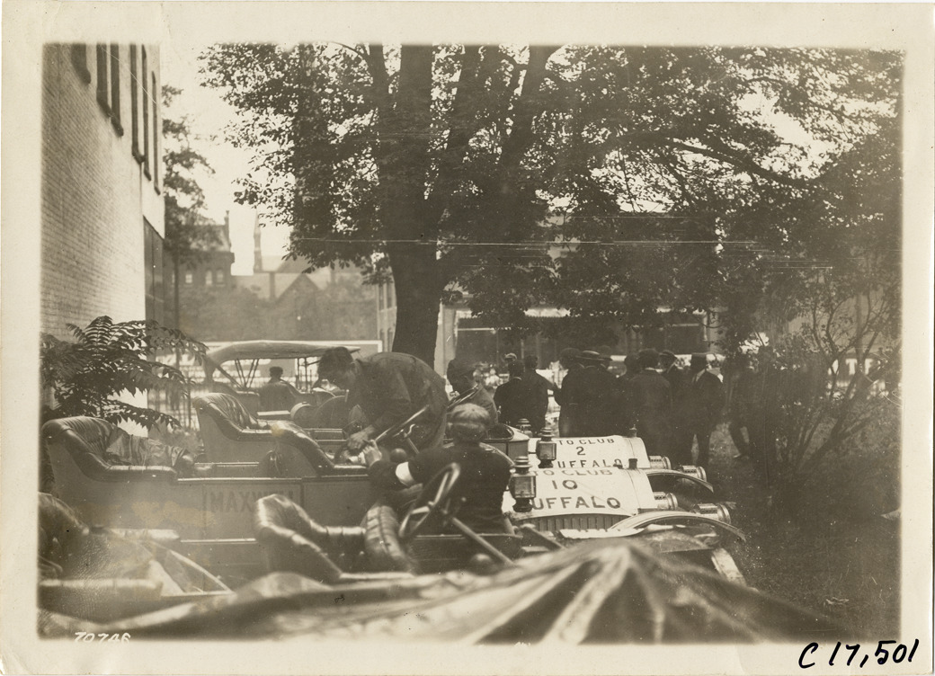 View of cars parked in front of building during the 1911 Buffalo Reliability Run in New York State. Group of men stand in background. Stamped on back: "Spooner & Wells, Inc., photographers, telephones 3472-3473 Columbus, 1931 Broadway, New York." Handwritten on back: "Tours--Buffalo Reliability Run, 1911."