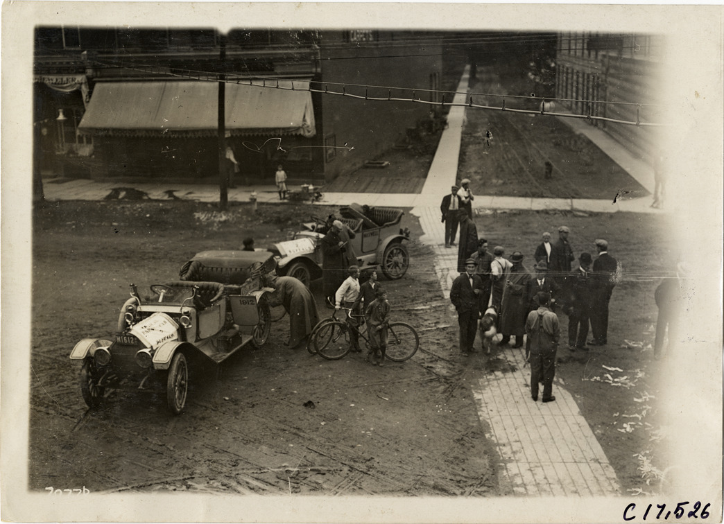Bird's-eye view of motorists on wooden sidewalk with 1912 Cole "40" pathfinder car and Maxwell car during the 1911 Buffalo Reliability Run in New York State. Boys with bicycles stand next to car; store in background. Stamped on back: "Spooner & Wells, Inc., photographers, telephones 3472-3473 Columbus, 1931 Broadway, New York." Handwritten on back: "Tours--Buffalo Reliability Run, 1911."