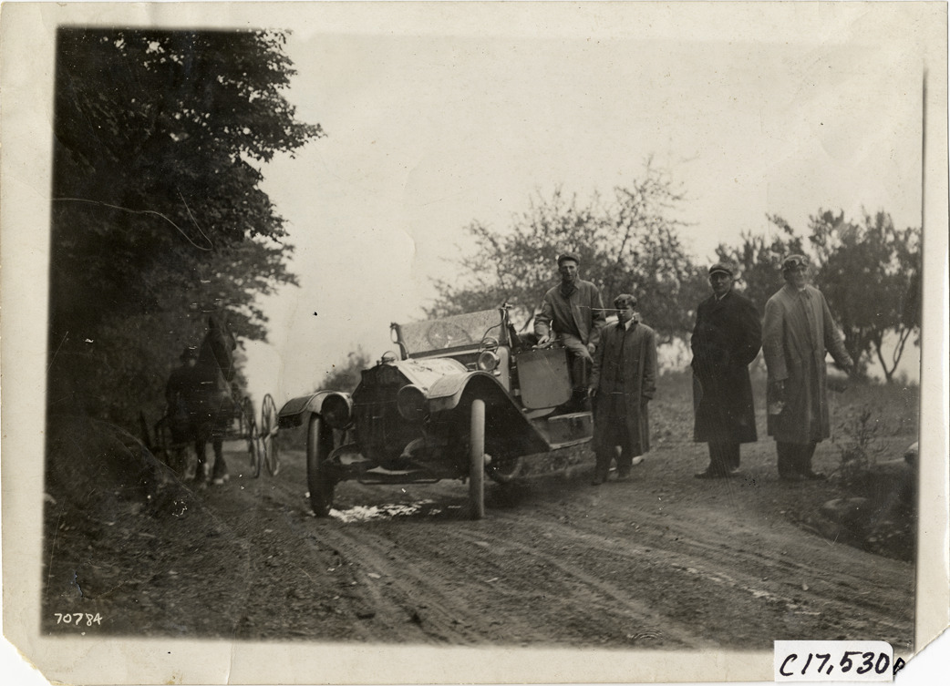 View of driver and passengers with car on rural road during the 1911 Buffalo Reliability Run in New York State. Horse-drawn wagon in background. Stamped on back: "Spooner & Wells, Inc., photographers, telephones 3472-3473 Columbus, 1931 Broadway, New York." Handwritten on back: "Tours--Buffalo Reliability Run, 1911."