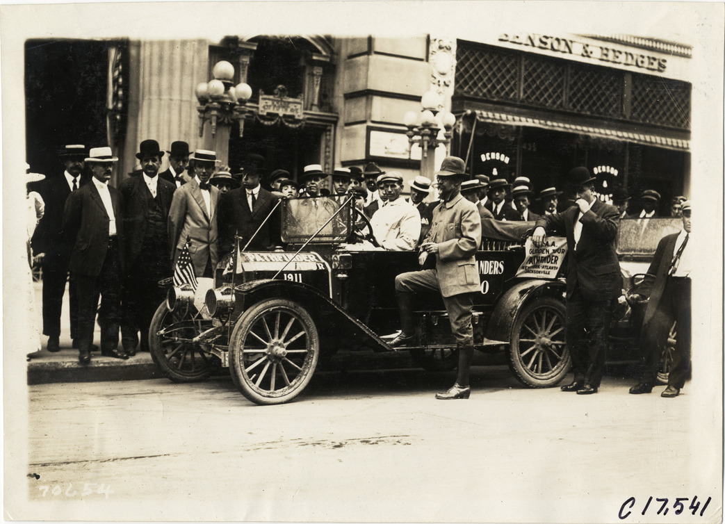 View of officials posing with Flanders "20" pathfinder car parked in front of building during the 1911 Buffalo Reliability Run in New York State. Onlookers stand on sidewalk in background. "A.A.A. Glidden Tour, pathfinder, New York, Atlanta, Jacksonville" sign displayed on car. Stamped on back: "Spooner & Wells, Inc., photographers, telephones 3472-3473 Columbus, 1931 Broadway, New York." Handwritten on back: "Tours--Buffalo Reliability Run, 1911."