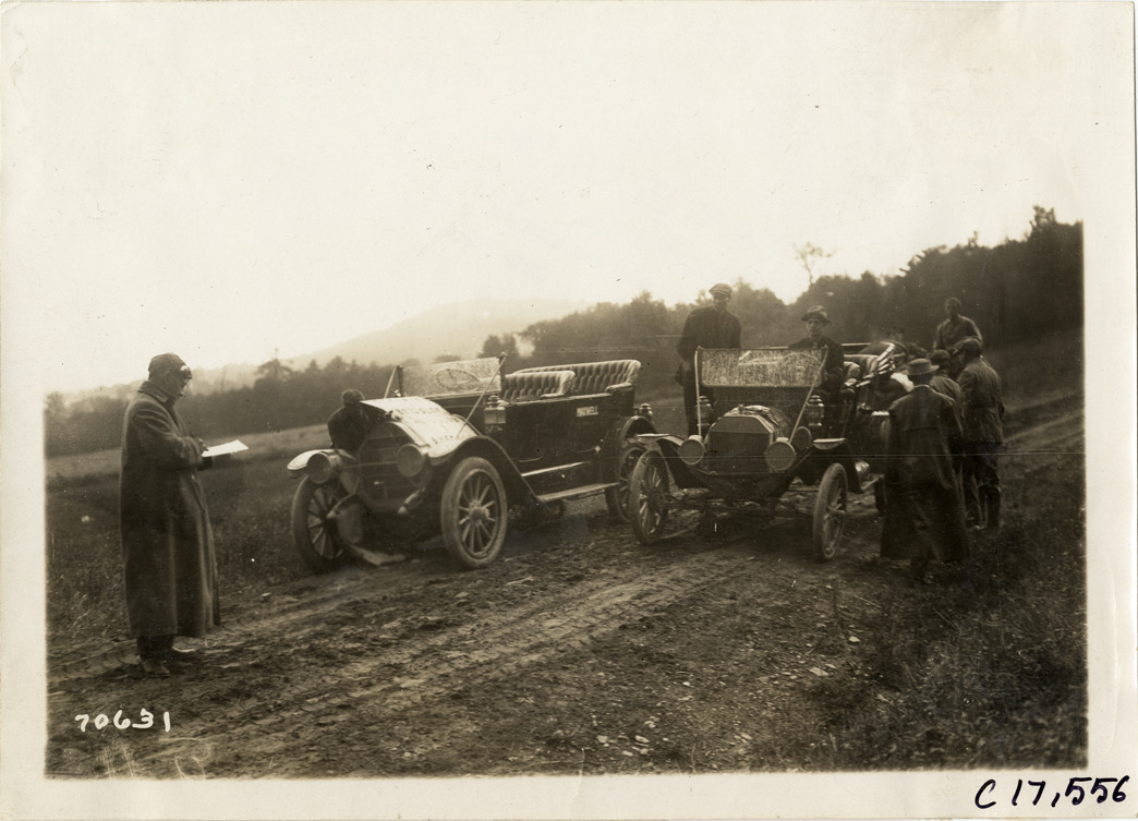 View of motorists with two cars on rural road during the 1911 Buffalo Reliability Run in New York State. Stamped on back: "Spooner & Wells, Inc., photographers, telephones 3472-3473 Columbus, 1931 Broadway, New York." Handwritten on back: "Tours--Buffalo Reliability Run, 1911."