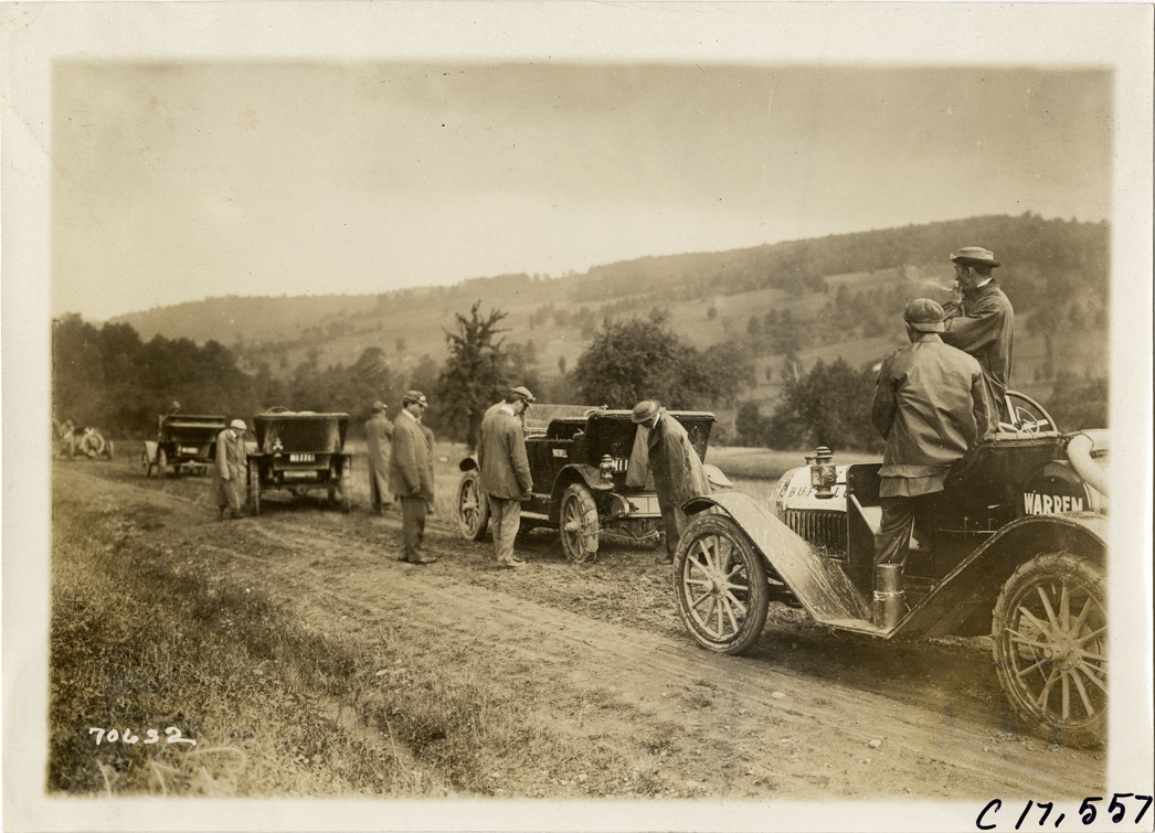 View of motorists with cars lined up on rural road during the 1911 Buffalo Reliability Run in New York State. Stamped on back: "Spooner & Wells, Inc., photographers, telephones 3472-3473 Columbus, 1931 Broadway, New York." Handwritten on back: "Tours--Buffalo Reliability Run, 1911."