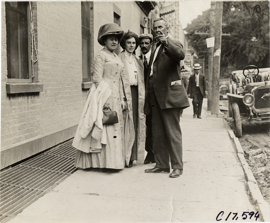 View of Mr. Jewell, Mrs. Fosdick, Mrs. Lee and an unidentified man on sidewalk in Poughkeepsie, New York during the 1909 Catskill-Berkshire Tour sponsored by the New York Automobile Trade Association. The tour covered a route through New York, New Jersey, Massachusetts and Connecticut. Stamped on back: "Spooner & Wells, Inc., photographers, telephones 3472-3473 Columbus, 1931 Broadway, New York." Handwritten on back: "Mr. Jewell, Mrs. Fosdick, Mrs. Lee. Tours--Catskill-Berkshire Tour, 1909."