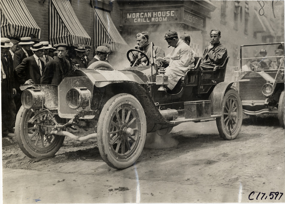 Motorists in Knox automobile in front of Morgan House hotel, 1909 Catskill-Berkshire Tour