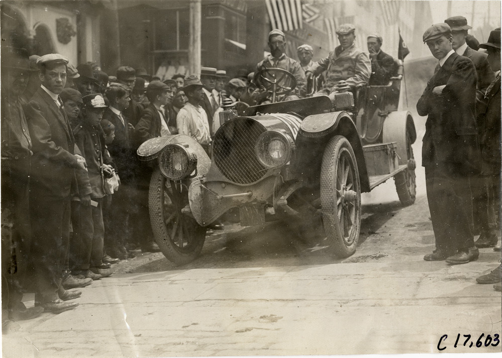 View of driver and passengers in Franklin car parked on street during the 1909 Catskill-Berkshire Tour sponsored by the New York Automobile Trade Association. Onlookers stand on sidewalk. The tour covered a route through New York, New Jersey, Massachusetts and Connecticut. Stamped on back: "Spooner & Wells, Inc., photographers, telephones 3472-3473 Columbus, 1931 Broadway, New York." Handwritten on back: "Tours--Catskill-Berkshire Tour, 1909."