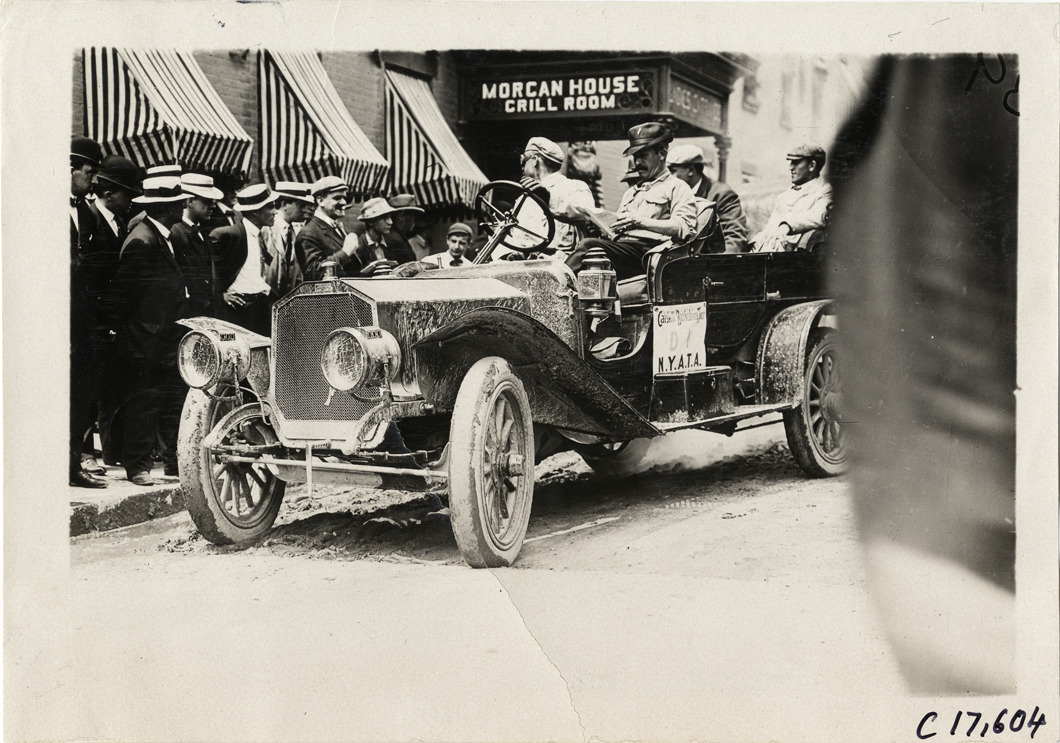 View of driver and passengers in car in front of the Morgan House hotel in Poughkeepsie, New York during the 1909 Catskill-Berkshire Tour sponsored by the New York Automobile Trade Association. The tour covered a route through New York, New Jersey, Massachusetts and Connecticut. Handwritten on back: "Tours--Catskill-Berkshire Tour, 1909."