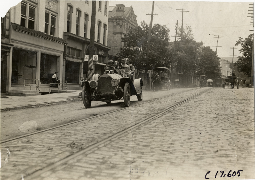 View of driver and passengers in car during the 1909 Catskill-Berkshire Tour sponsored by the New York Automobile Trade Association. Commercial buildings on left; horse-drawn carriage and wagon in background. The tour covered a route through New York, New Jersey, Massachusetts and Connecticut. Stamped on back: "Spooner & Wells, Inc., photographers, telephones 3472-3473 Columbus, 1931 Broadway, New York." Handwritten on back: "Tours--Catskill-Berkshire Tour, 1909."