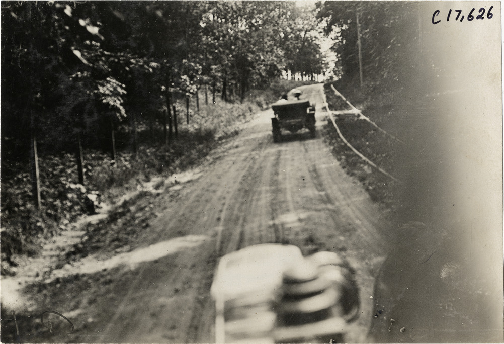 Rear view of motorists in car on rural road during the 1909 Catskill-Berkshire Tour sponsored by the New York Automobile Trade Association. The tour covered a route through New York, New Jersey, Massachusetts and Connecticut. Stamped on back: "Spooner & Wells, Inc., photographers, telephones 3472-3473 Columbus, 1931 Broadway, New York." Handwritten on back: "Tours--Catskill-Berkshire Tour, 1909."
