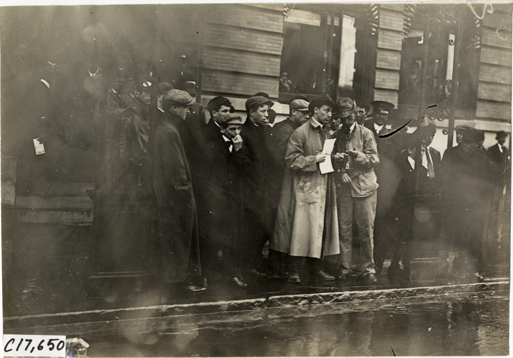 View of Secretary Walter R. Lee and officials checking in cars in Pittsfield, Massachusetts during the 1909 Catskill-Berkshire Tour sponsored by the New York Automobile Trade Association. Onlookers stand on sidewalk. The tour covered a route through New York, New Jersey, Massachusetts and Connecticut. Stamped on back: "Spooner & Wells, Inc., photographers, telephones 3472-3473 Columbus, 1931 Broadway, New York." Handwritten on back: "Secretary Lee and [undecipherable] checking cars at Pittsfield. Tours--Catskill-Berkshire Tour, 1909."