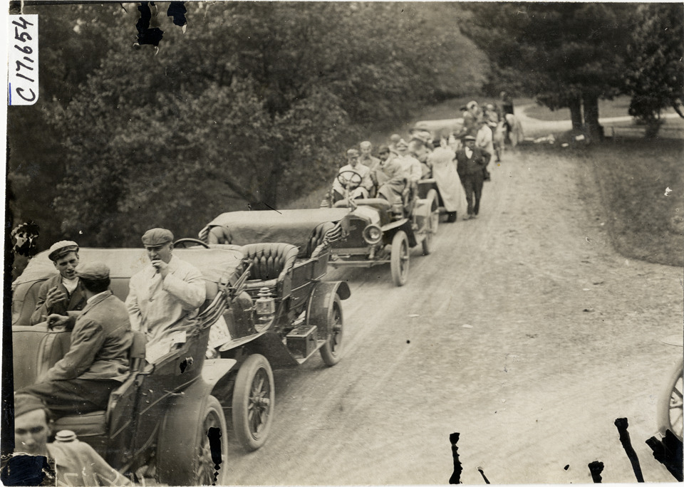 View of cars lined up in road at Catskill, New York during the 1909 Catskill-Berkshire Tour sponsored by the New York Automobile Trade Association. The tour covered a route through New York, New Jersey, Massachusetts and Connecticut. Stamped on back: "Spooner & Wells, Inc., photographers, telephones 3472-3473 Columbus, 1931 Broadway, New York." Handwritten on back: "Lined up to start at Catskill. Tours--Catskill-Berkshire Tour, 1909."