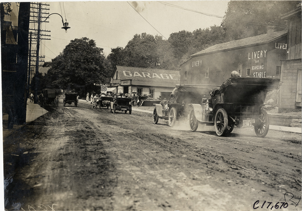 View of motorists in cars lined up in road at Highland, New York during the 1909 Catskill-Berkshire Tour sponsored by the New York Automobile Trade Association. Garage, livery and boarding stable on right. The tour covered a route through New York, New Jersey, Massachusetts and Connecticut. Stamped on back: "Spooner & Wells, Inc., photographers, telephones 3472-3473 Columbus, 1931 Broadway, New York." Handwritten on back: "Cars checking in at Highlands [sic]. Tours--Catskill-Berkshire Tour, 1909."